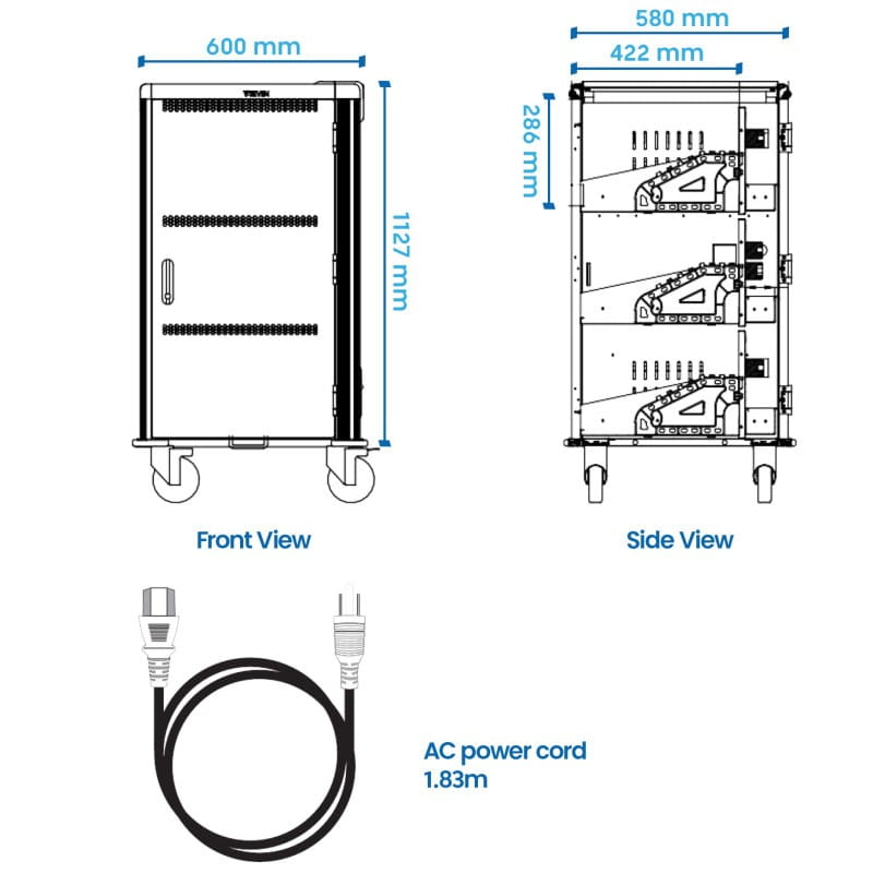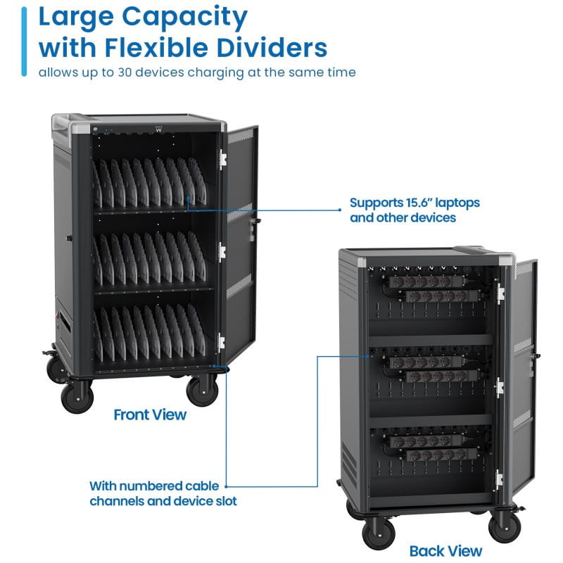 - Pojemność szafy: 30 dedykowanych slotów (po 10 na każdej z 3 półek) na tablety, notebooki lub laptopy o wielkości do 15.6"