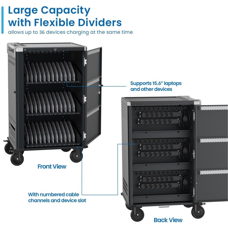 Profesjonalna, wysokiej klasy mobilna szafa do bezpiecznego przechowywania i jednoczesnego ładowania aż do 36 notebooków, laptopów do 15.6" lub tabletów. Wyposażona w system inteligentnego ładowania, system organizacji urządzeń oraz ich okablowania, z ochroną przed przeciążeniem i zwarciem. Gotowa to wdrożenia i natychmiastowej pracy w instytucjach edukacyjnych czy środowiskach korporacyjnych.