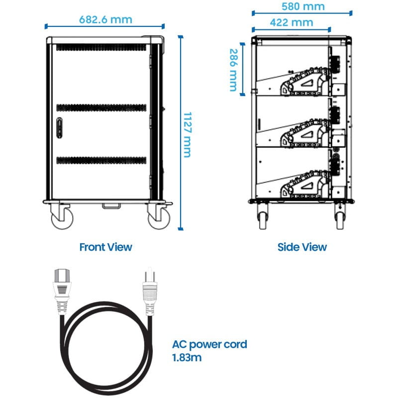 - Pojemność szafy: 36 dedykowanych slotów (po 12 na każdej z 3 półek) na tablety, notebooki lub laptopy o wielkości do 15.6"