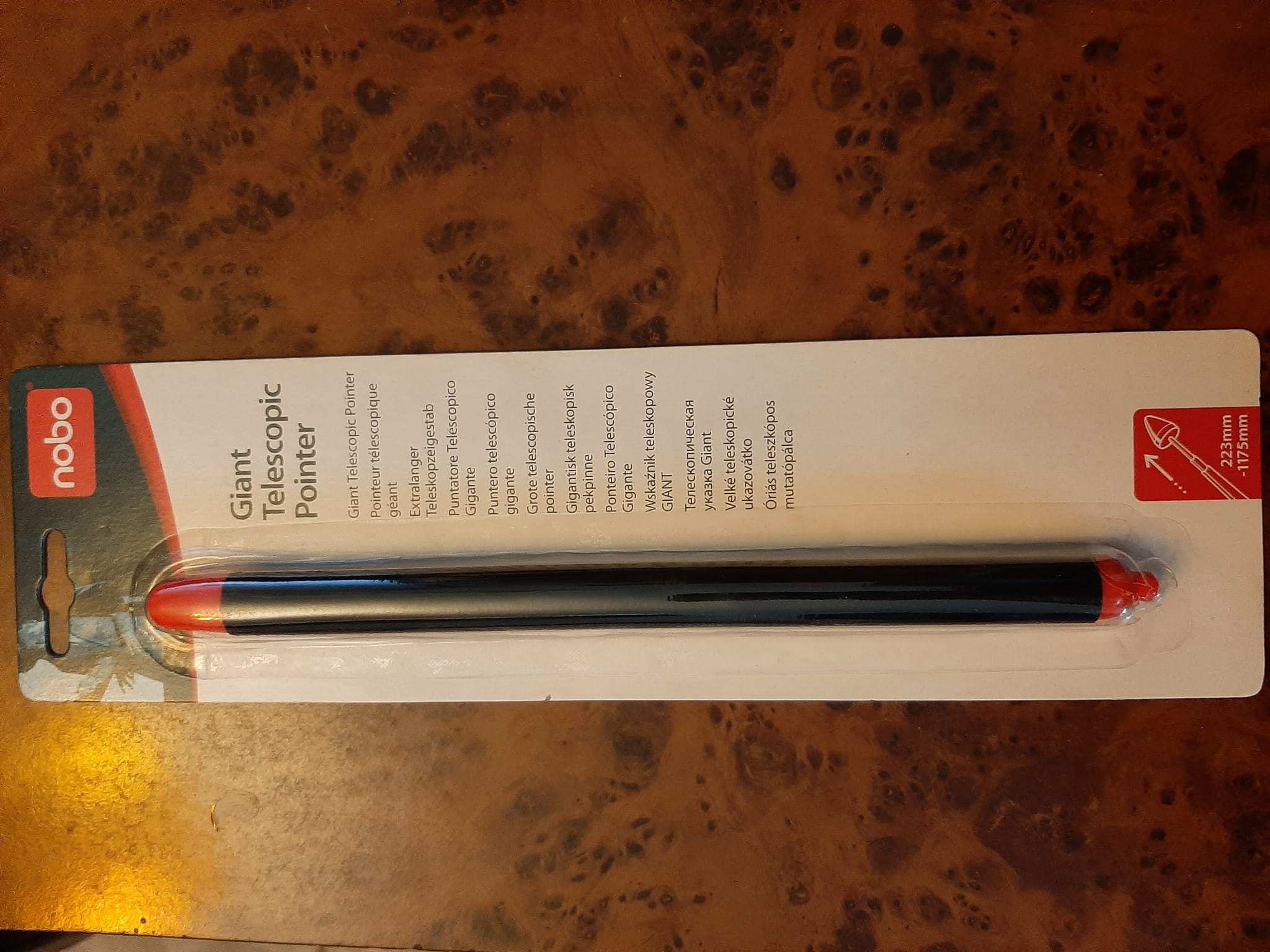 Wyjątkowo długi wskaźnik teleskopowy NOBO Giant ma pomarańczową końcówkę, która przyciąga uwagę do wskazywanego elementu.